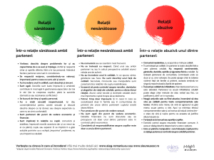 Orice dinamică interumană poate pendula pe această axă de la sănătos la abuziv. Întrucât relația de cuplu este de cel mai mare impact în viața adultă, ne vom concentra pe ea. Tu știi ce fel de relație de cuplu ai? Cum ai caracteriza-o? Descoperă mai jos ce caracterizează fiecare dinamică, conform National Domestic Violence Hotline (www.thehotline.org).